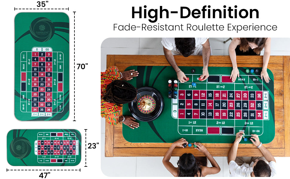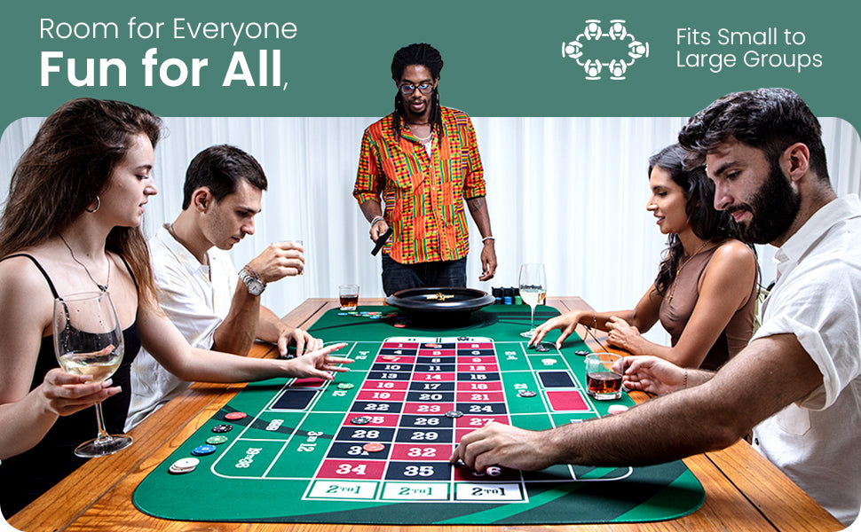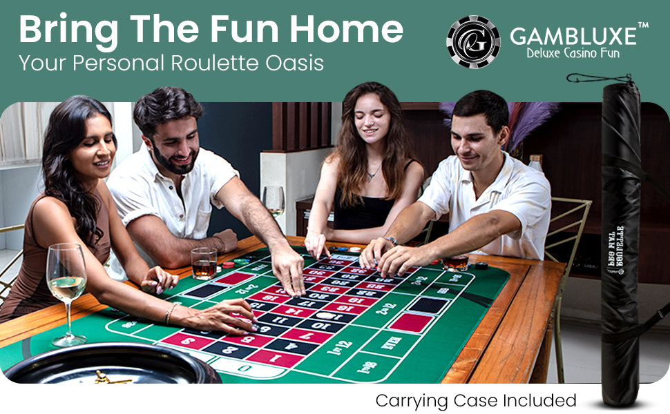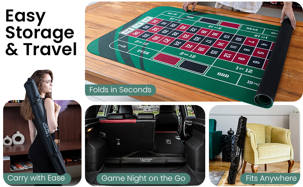 Bring the thrill of Vegas to your home game! This 47" x 23" Green Professional Roulette Mat with its vibrant graphic design, you'll feel just like a pro! It even comes with a handy carrying/storage case! Time to ante up!