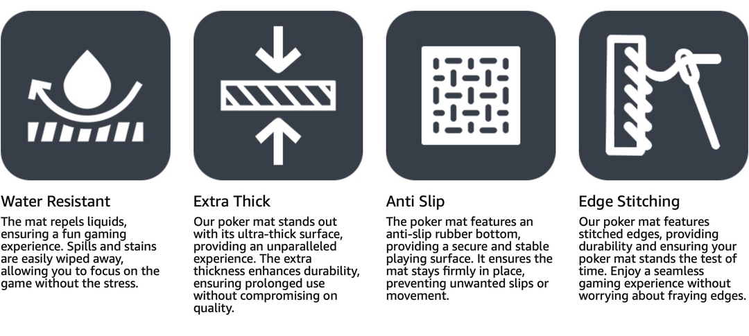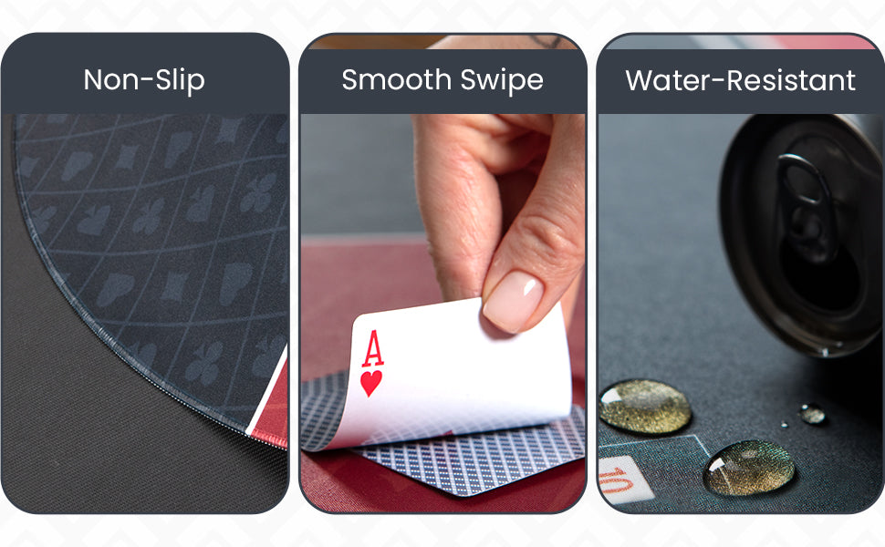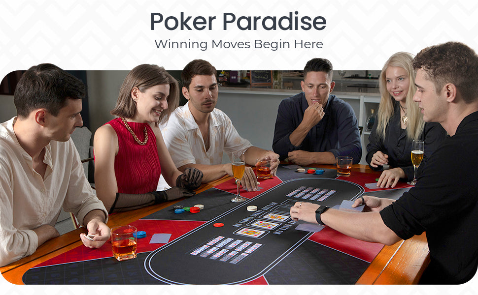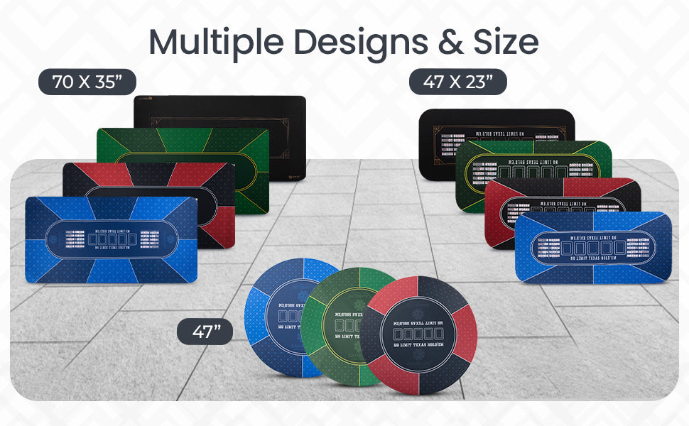 Bring the thrill of Vegas to your home game! This 70" x 35" Blue Professional Poker Mat makes a bold statement with its integrated Poker Hand Rankings Guide and is ready to help you raise the stakes. With its vibrant graphic design, you'll feel just like a pro! It even comes with a handy carrying/storage case! Time to ante up!